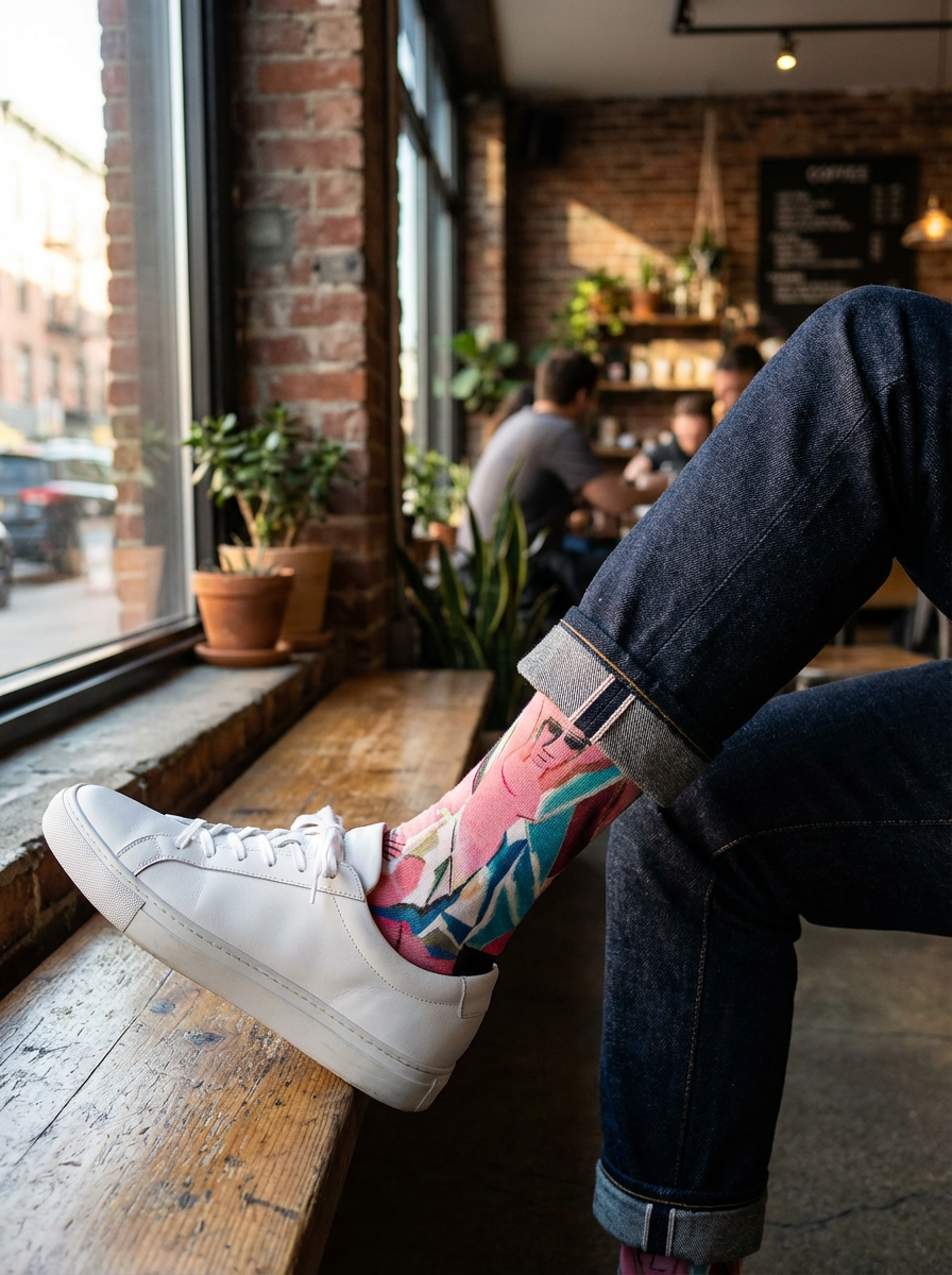 Vi bestämde oss för att skapa en detalj i en mans klädsel som går utöver färg – något som väcker nyfikenhet, lyfter en klädsel och får en eller två ögonbryn att höjas. Inte bara en djärv strumpa, utan en historia. Genom att förena konst och mode fann vi ett sätt att föra in mästerverk i vardagen, ett steg i taget.